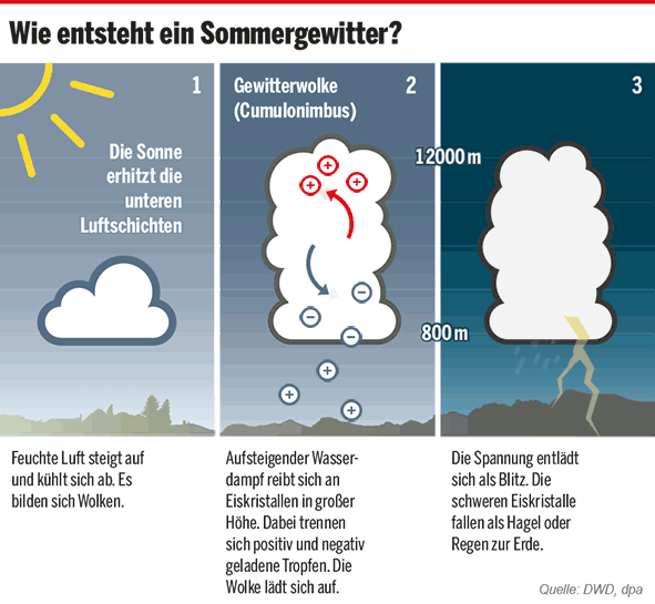 Die Feuchtigkeit und das Wasser aus dem Boden oder aus Gewässern, versdunstet durch die Hitze der Sonne. Der dadurch entstehende Wasserdampf steigt auf und kühlt ab. Die nun enstandenen Wolken werden immer mehr zu Gewitterwolken und ergießen sich, wenn sie zu schwer werden. Dann spricht man von einem Schauer. Sind dann Blitze zu sehen und Donner zu hören, spricht man von einem Gewitter. Mehr unter: Webseite: So entsteht ein Gewitter